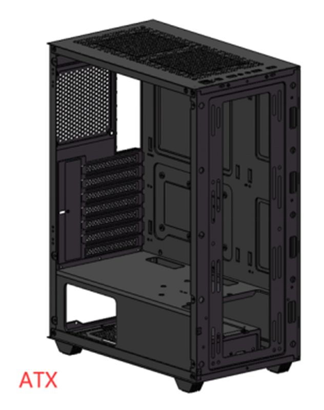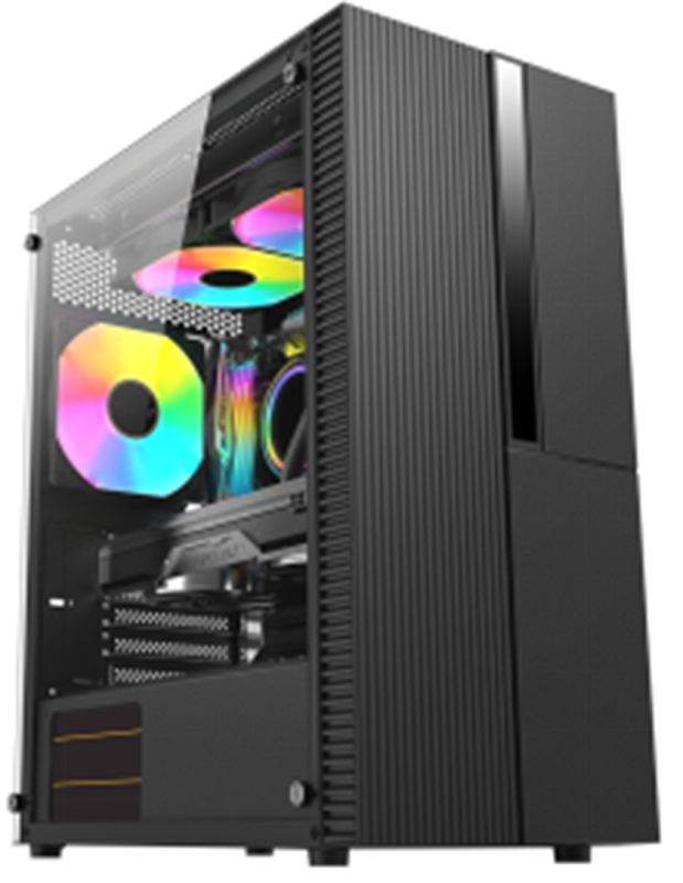 High-quality ATX gaming computer case in black, featuring a left-side tempered glass panel secured with screws for a sleek and durable design. Supports up to 2 HDDs and 2 SSDs for ample storage. Offers extensive cooling options with front, top, and rear fan support (120/140/240/280mm). Designed with 2x USB 1.0, 1x USB 3.0, audio and microphone ports for convenient connectivity. Built to accommodate CPUs up to 160mm and VGA cards up to 325mm in length. Ideal for high-performance gaming and workstation builds.