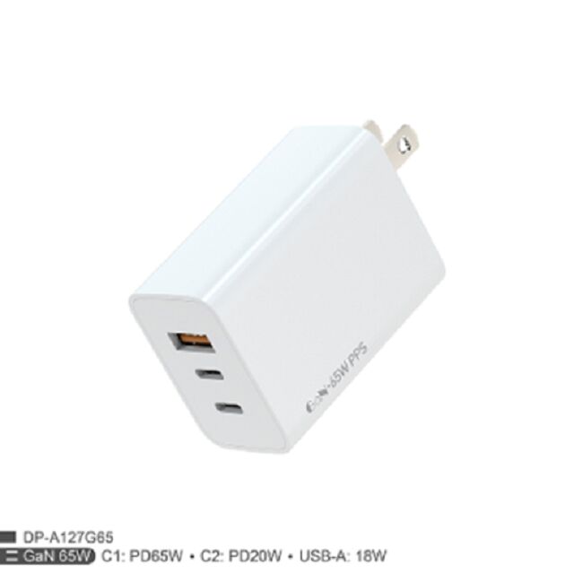 Compact 65W dual-port charger with US plug, supporting PD 3.0 (up to 36W on USB-C) and Quick Charge 3.0 (18W on USB-A) independently. When used simultaneously, delivers 20W (C) + 12W (A). Input: AC 100–240V for global use. Output specs: USB-C: 5/9/12/15/20V; USB-A: 5/9/12V. Dimensions: only 43.5×28×76.2mm—smaller than most 45W adapters.This 65W dual-port charger packed in PE bag, ideal for laptops, phones, and tablets needing fast, reliable charging without bulk.